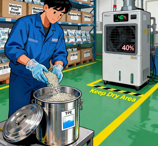 Ba cheart amhábhair TPE a stóráil ar shiúl ó dhálaí tais. Moltar ábhair a choinneáil i gceantair thirim, dea-aeráilte. Féadfaidh timpeallachtaí ard-taise a bheith ina chúis le hionsú taise, drochthionchar a imirt ar fheidhmíocht próiseála ina dhiaidh sin agus ar chaighdeán an táirge críochnaithe.